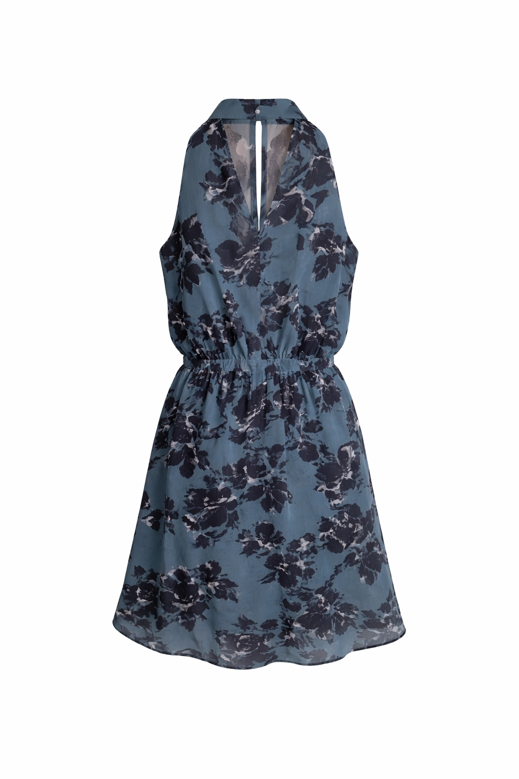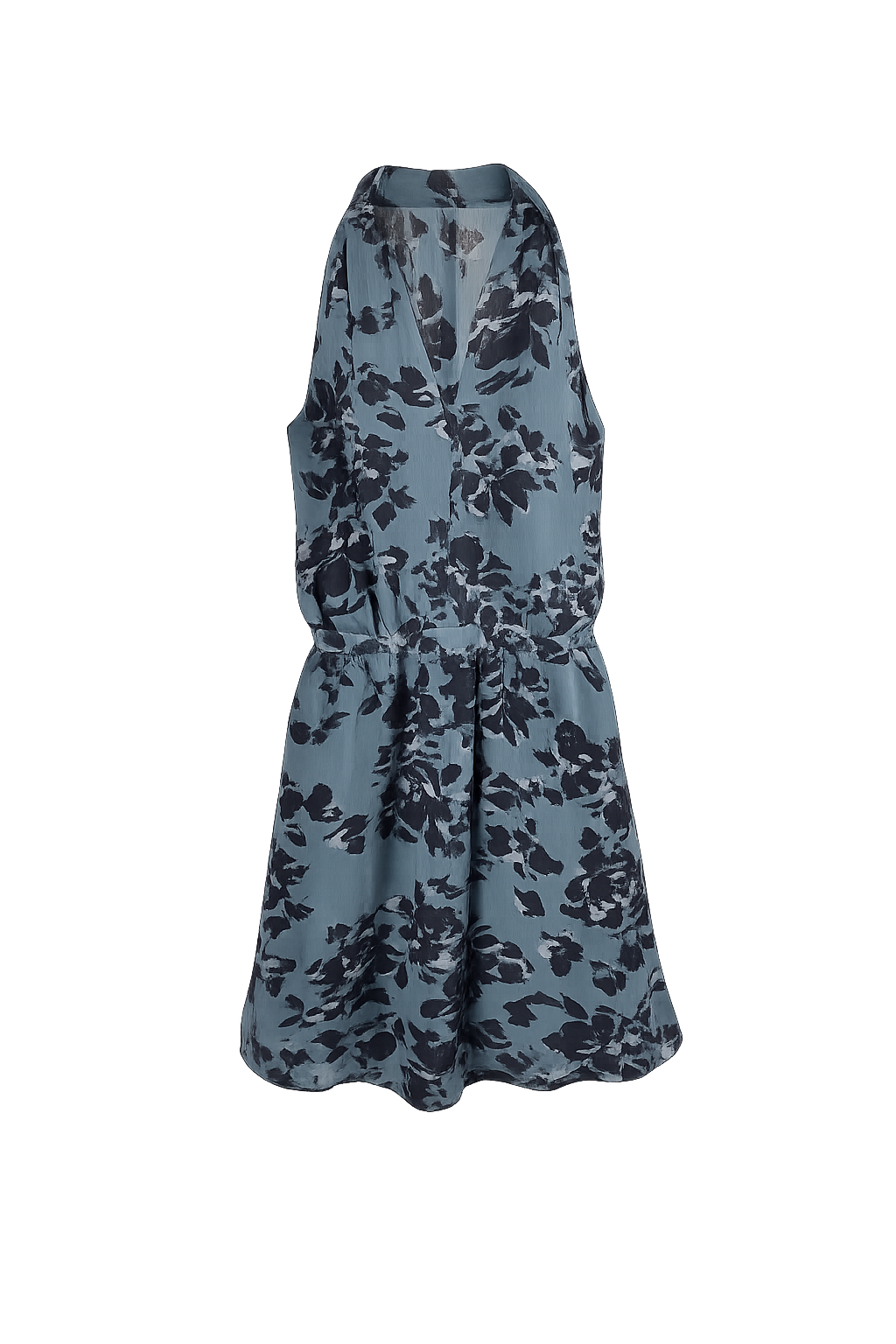 Effortless and feminine, this Banana Republic sleeveless dress features a soft blue-gray base with an abstract floral print for an elevated everyday look. Designed with a flattering V-neckline, subtle halter-style collar, and a gently cinched elastic waist, it creates an easy, flowy silhouette that moves beautifully.