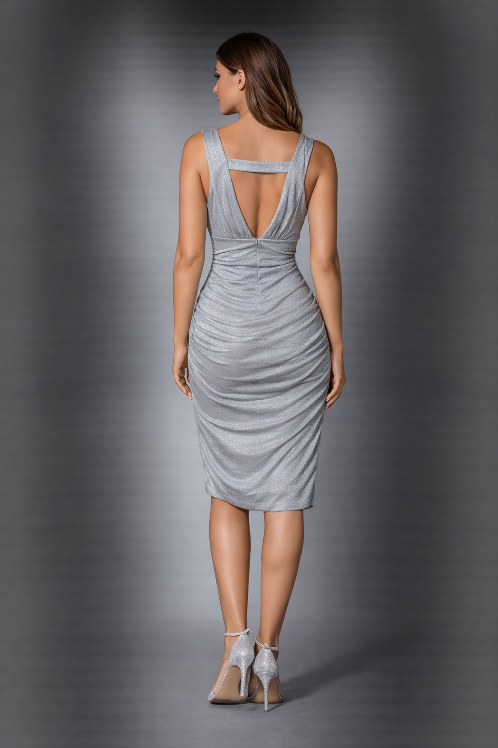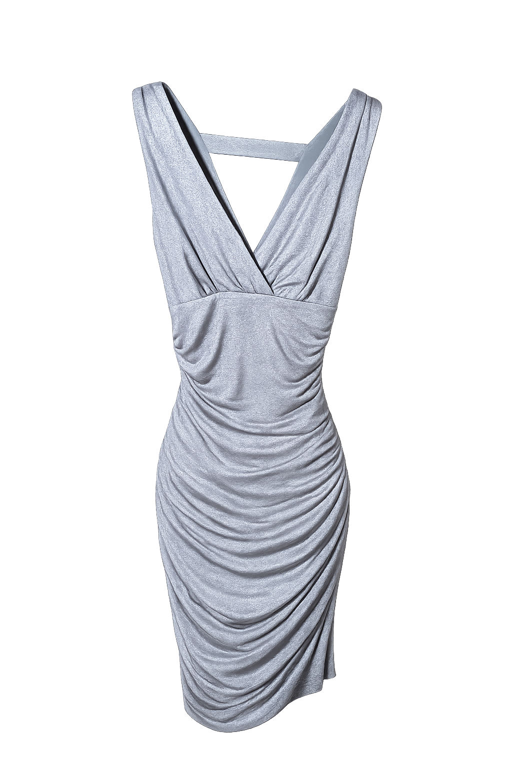 Turn heads in this stunning Guess silver shimmer cocktail dress. Designed with a flattering deep V-neckline, wide shoulder straps, and an elegant open back detail, this dress hugs in all the right places. Soft ruching throughout the body creates a sleek, curve-enhancing silhouette while the subtle metallic sheen adds just the right amount of sparkle.