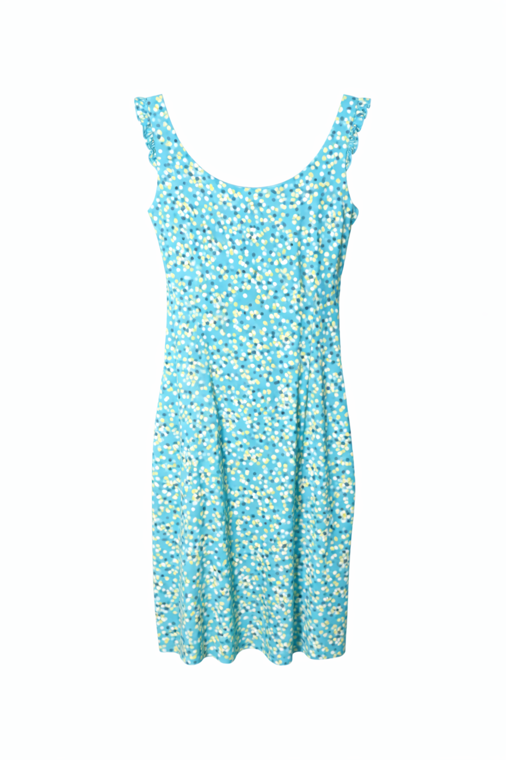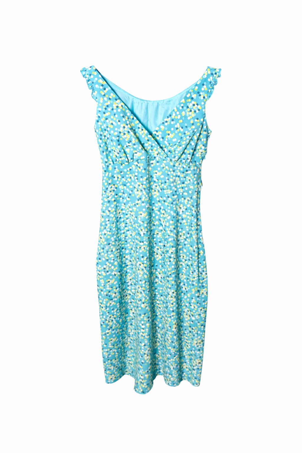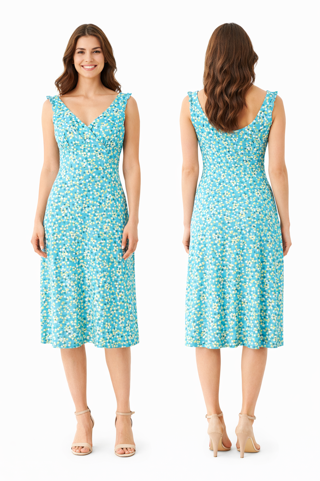 Bright, flattering, and easy to wear, this sleeveless dress from The Limited features a fresh turquoise base with a playful white and yellow dot/floral print. Designed with a feminine V-neck wrap front, ruffled shoulder straps, and a softly flared skirt, it’s a versatile piece that moves effortlessly from daytime events to casual evenings.