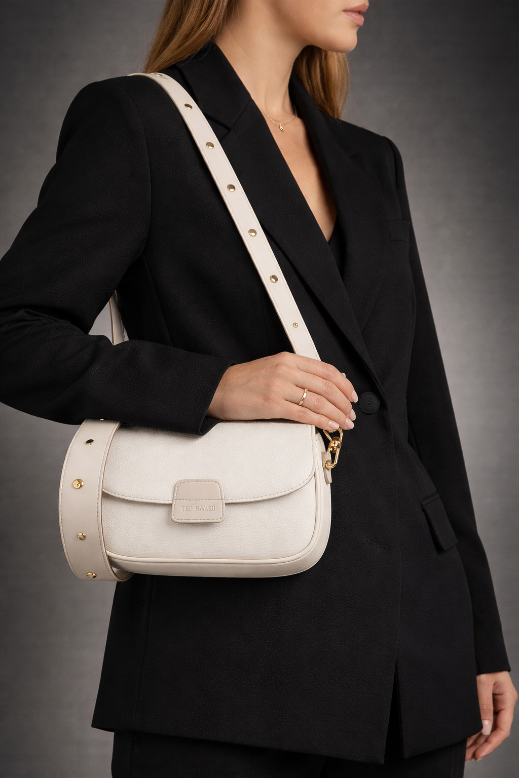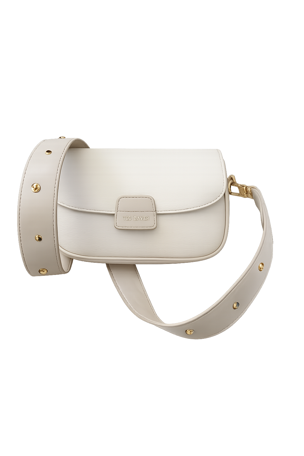 Elevate your everyday look with this timeless Ted Baker cream crossbody bag. Designed with a structured silhouette and refined gold-tone hardware, this piece blends polished elegance with effortless versatility. The adjustable stud-detailed strap allows for comfortable wear, whether styled crossbody or over the shoulder, making it perfect for both day and evening looks.