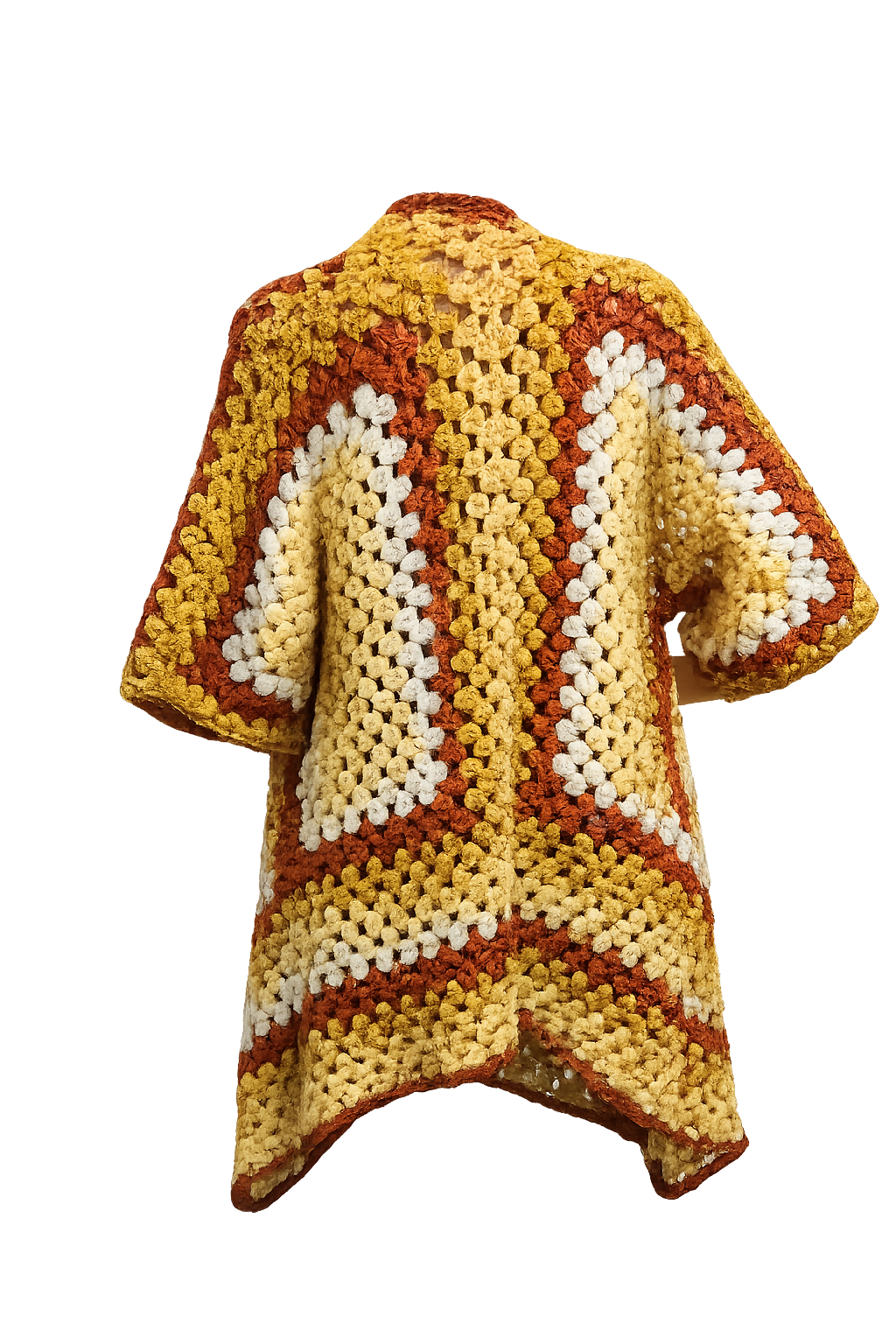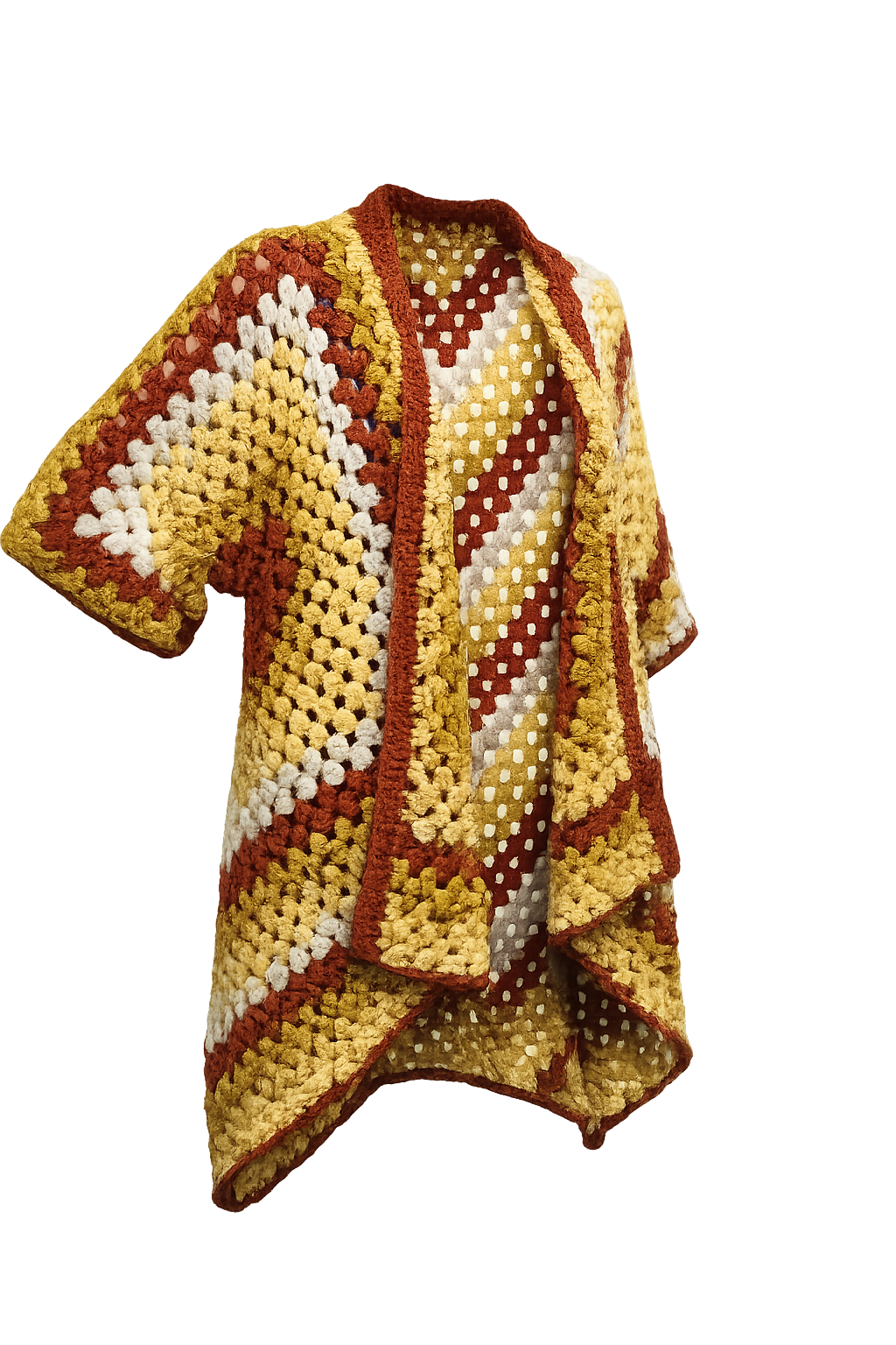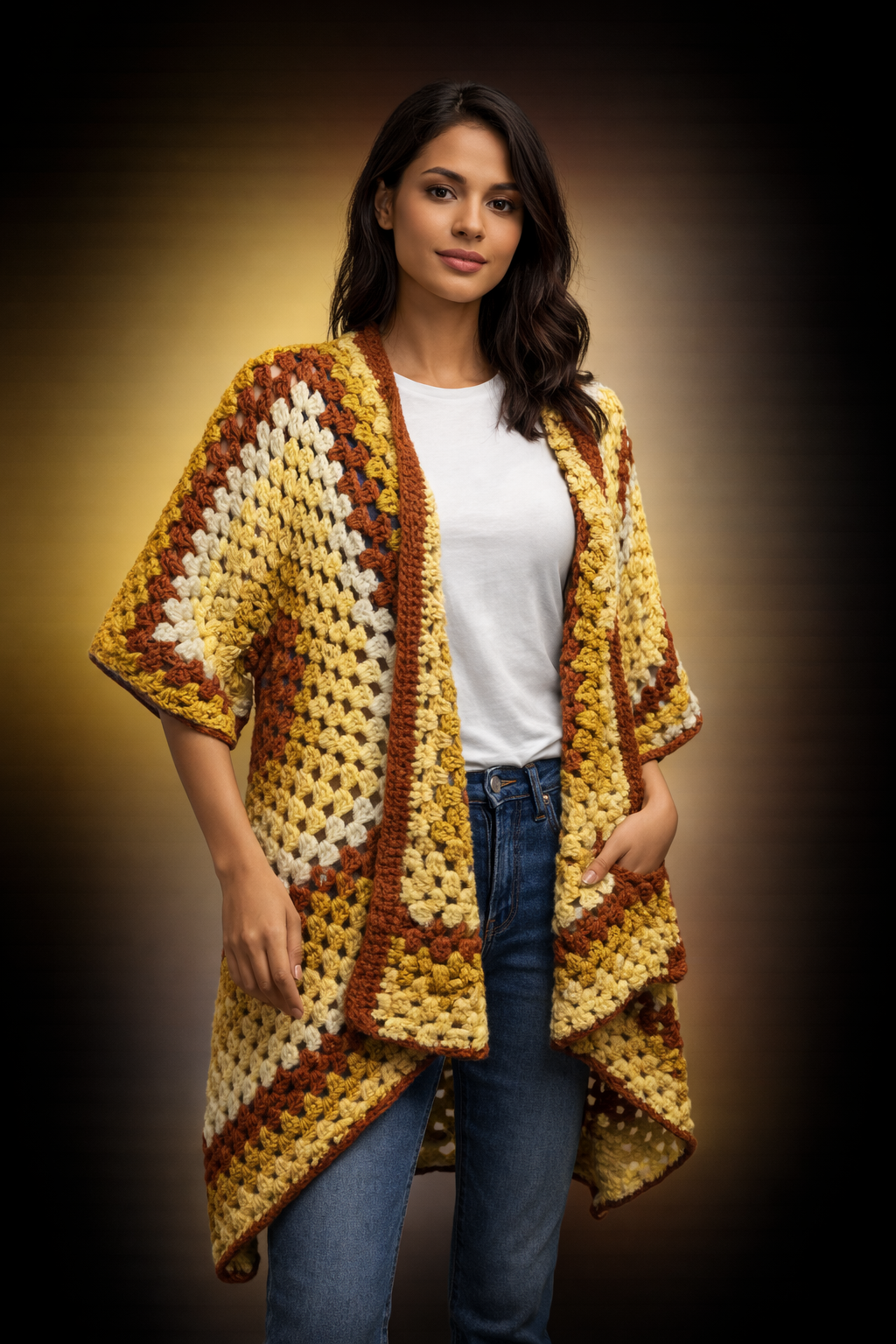 Wrap yourself in effortless, handcrafted style with this Designs by Laura crochet cardigan. Featuring a beautiful blend of warm mustard yellow, cream, and rich rust tones, this one-of-a-kind piece adds texture and personality to any outfit. The open-front design and relaxed silhouette make it easy to layer over a tee and jeans or dress up with boots and accessories.