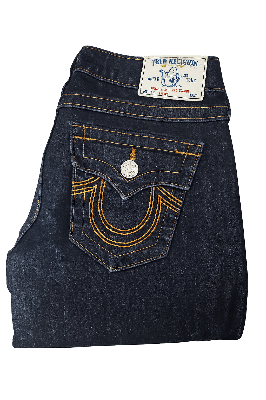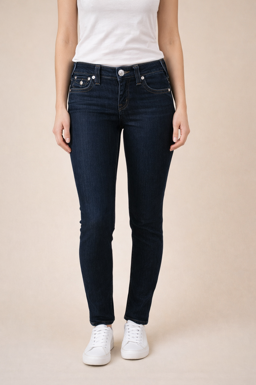 Premium denim skinny jeans from True Religion, crafted with a sleek, close-fitting silhouette that flatters the waist and hips. These size 27 jeans feature a mid-rise, zip-fly closure, and classic five-pocket styling for everyday wear. Designed with stretch denim for comfort and mobility, they include signature True Religion details like horseshoe stitching on the back pockets and contrast stitching for a timeless look. Ideal for casual or dressed-up outfits, these skinny jeans offer a modern silhouette with a snug fit from hip to ankle.