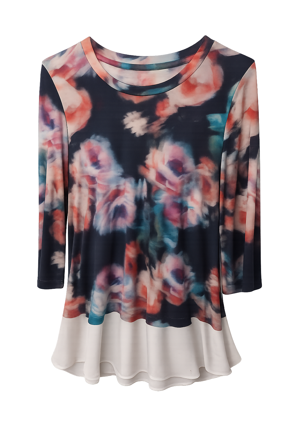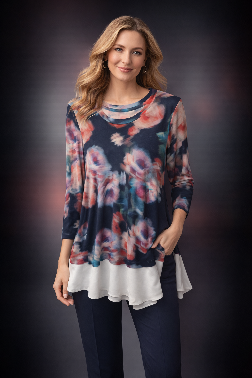 Chic and effortless, this Karen Kane tunic features a soft abstract floral print in rich navy, blush, teal, and ivory tones. Designed with a relaxed, flowy fit, scoop neckline, long sleeves, and a layered contrast hem, it’s perfect for pairing with trousers, leggings, or denim.